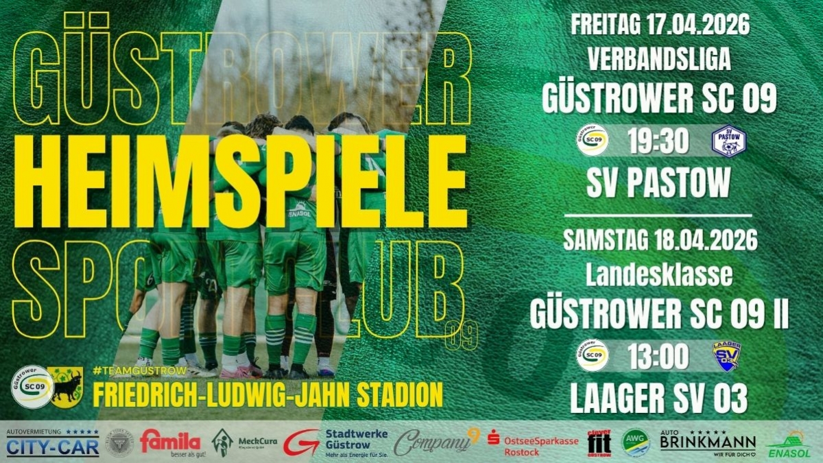 • 19:30 – Herren | Verbandsliga Güstrower SC 09 – SV Pastow